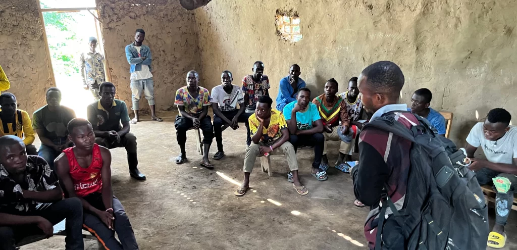 Sammy from the Umoja Radio team meets community members from Kachanga village